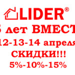 Группа компаний LIDER в честь своего пятнадцатилетия объявляет о акции! 12, 13, 14 апреля – скидки до 15% на всю линейку предлагаемых товаров. Мы благодарим всех клиентов за оказанное доверие и будем рады видеть Вас в офисах нашей компании! LIDER – 15 лет вместе!