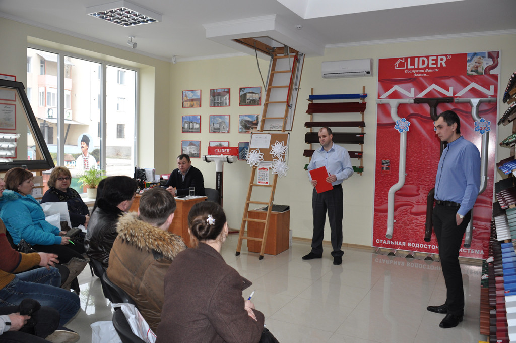 7 февраля на базе Слободзейского филиала ООО«Евродизайн» был проведён семинар для партнёров по продукции и товарам, предлагаемым группой компаний «LIDER». В ходе данного мероприятия был рассмотрен ряд вопросов, касающихся таких направлений, как: металлочерепица, профнастилы, металлические и пластиковые водосточные системы, окна ПВХ, битумная черепица Shinglas, мансардные окна и чердачные лестницы Fakro. В программе семинара мы уделили внимание всем вопросам, касающимся производства, монтажа и конечной эксплуатации наших материалов. В роли ведущих выступали наши специалисты и приглашенные гости. Мы надеемся, что полученная информация поможет нашим партнёрам в дальнейшей работе.