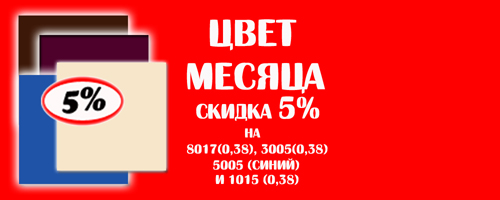 Цвет месяца! Добавлено 15 ноября, 2016 by Lider Спешим сообщить об изменениях по данной акции: Скидка 5% на цвета: 8017 (0,38), 3005(0,38), 1015 (0,38) и 5005! Время действия предложения, равно как и количество материала — ОГРАНИЧЕНО! С уважением, группа компаний LIDER.